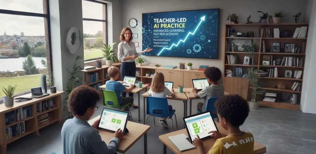 In teacher-led AI learning, AI acts as a helper, not a replacement. Teachers decide: